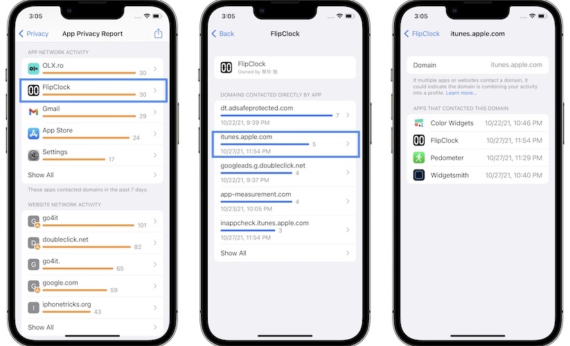 Advice: Tap the domain to see all the apps that have contacted the same domain. If more than one application is contacting the same domain, it may indicate that the domain is trying to combine your activity into a profile.