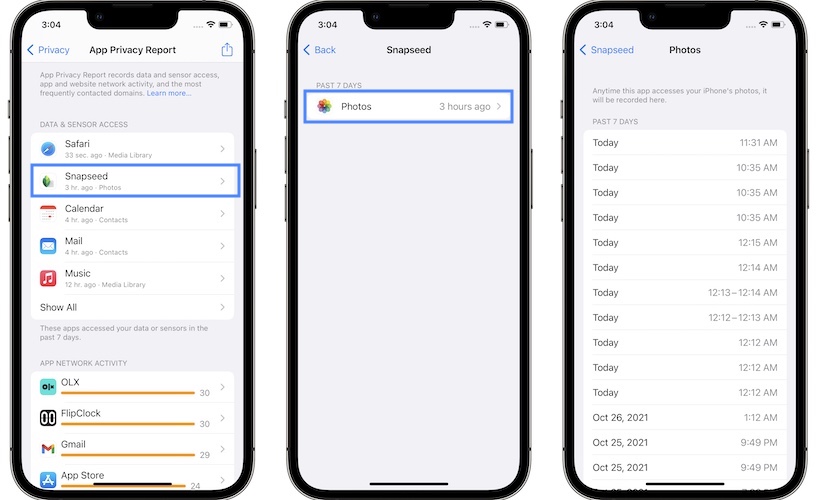 In this section, iOS 15 lists the apps that accessed your data and sensor in the past 7 days. The sensitive information tracked in this section is: Camera, microphone, contacts, location, photos, and Media library.