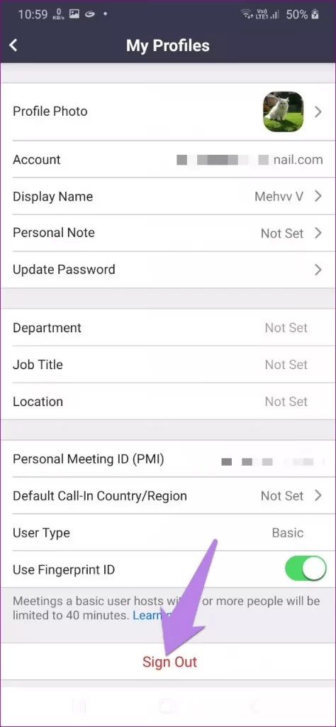 Likewise, you must also be logged in to the Zoom mobile apps. To check if you’re signed in or not, open the Zoom app and tap the Settings tab. Here you should see your name, profile picture and email address at the top. Tap the section containing these three. If you’re signed in from another account, tap Sign Out. Then log in with the correct account.